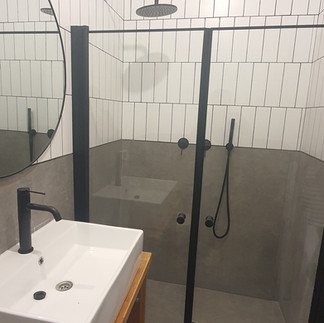 חדר הרחצה: המשכנו את הקו המהודק עם פלטת צבעים של אפור-לבן-שחור. זהו שילוב על-זמני שתמיד נראה נקי, רענן ומזמין.